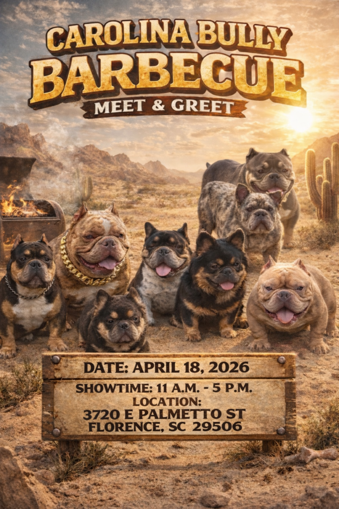 Carolina Bully Barbecue Meet & Greet is coming to Florence, SC on April 18, 2026 from 11 AM – 5 PM. Join bully owners, breeders, and dog lovers for a full day of great food, live vibes, and some of the best American Bullies around. This family-friendly outdoor event is the perfect place to connect, network, and celebrate bully culture while enjoying classic Carolina barbecue.