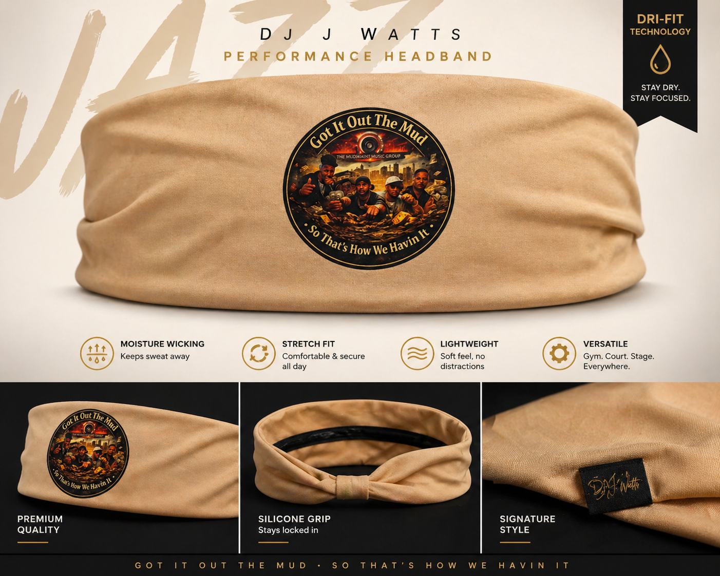 Stay locked in and elevate your grind with the DJ J Watts Tan Dri-Fit Performance Headband. Designed for comfort, style, and performance, this lightweight headband keeps sweat under control while delivering a bold statement with the exclusive “Got It Out The Mud – So That’s How We Havin It” logo.