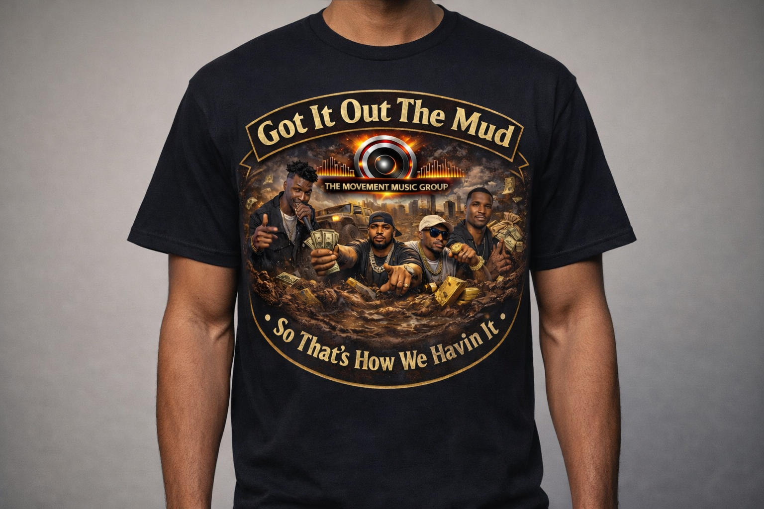 Make a bold statement with the Got It Out The Mud black short sleeve T-shirt, a powerful piece representing grind, resilience, and success earned the hard way. This premium tee features an eye-catching full-color graphic showcasing The Movement Music Group with a gold-accented circular design and the signature phrases “Got It Out The Mud” and “So That’s How We Havin It.”