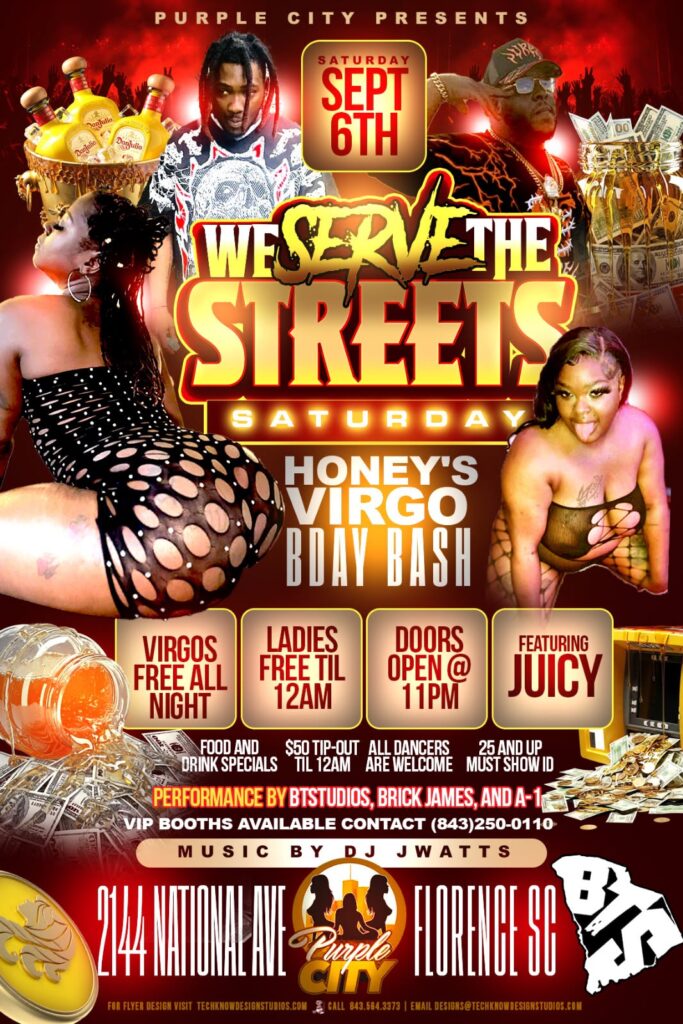 Purple City Presents We Serve the Streets Saturday Sept 6th Celebrating Honey Virgo Bday Bash #Florence|SC